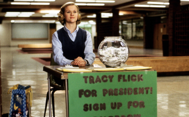 En Election (Alexander Payne, 1999) Jim McAllister (Matthew Broderick) es un profesor que enseña, entre otras cosas, moral y ética en un instituto de Omaha. Durante las elecciones escolares tiene que vérselas con su brillante y detestada alumna Tracy Flick (Reese Witherspoon. Tracy quiere ganar las elecciones y hará lo que esté en su mano para conseguirlo. Jim McAllister, por motivos personales, en vez de arbitrar imparcialmente en el evento, quiere pararle los pies a Tracy. Hacia la mitad de la cinta, consigue acorralar a la chica y, convencido de que vivir con honradez es la mejor opción, le larga un discurso moralista que, por supuesto, cae en saco roto, en el saco roto de la ambición desmedida de Tracy. La estudiante gana las elecciones a pesar de los obstáculos que le pone Jim, quien, en el proceso pierde su empleo y a su mujer. Al final de la película la vida de los dos personajes vuelve a cruzarse fugazmente. Tracy, vestida de traje, está entrando en la limusina de un político republicano, mientras que el señor McAllister, con cierta pinta de paleto, no puede hacer otra cosa que lanzarle el vaso de plástico que tiene en la mano; es una forma de vengarse del destino y de ella. La limusina frena en seco. Jim echa a correr en dirección contraria, como si fuese un auténtico delincuente.