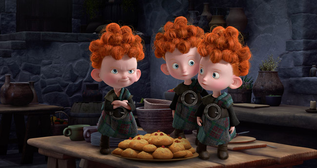 Tampoco puede dejarse de lado la tríada de diablillos que campa por el castillo haciendo de las suyas, ayudando o estorbando, pero siempre por dos razones: la diversión o la gula. Merida también. Es una adolescente, con todo lo que eso conlleva, y se comporta como tal, con inseguridades y miedos y dudas. Tiene pocas cosas claras: que su magnífica melena tiene que quedar tan libre como ella, que nadie puede decirle lo que tiene que hacer y que le encantan los pasteles sin que le preocupe lo más mínimo si aumenta una talla de vestido.